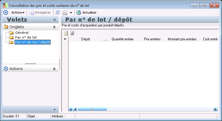 Ce volet affiche la liste de tous les dépôts. Seul celui dans lequel le produit comportant le numéro de lot interrogé est ou a été stocké comporte des informations chiffrées.