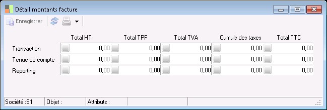 Cette fenêtre s'ouvre après avoir cliqué sur le lien Total TTC du volet Pied d'une facture d'achat. Elle donne le détail des totaux HT, TVA, TPF et taxes cumulées en monnaie de tenue de compte et devise et ne permet aucune modification.