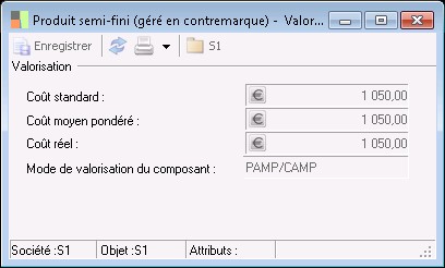 Le mode de valorisation des sorties de composants permet d'initialiser le prix proposé pour la valorisation de chaque ligne de détail du plan d'assemblage et par extension pour l'entrée en stock du composé :