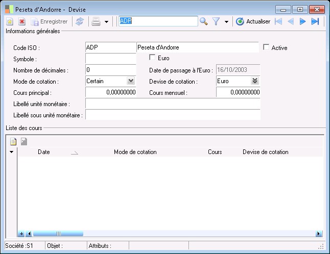 Cette zone indique le cours principal de la devise. Lorsqu'aucun cours à date n'est trouvé pour cette devise, c'est ce cours principal qui est utilisé.