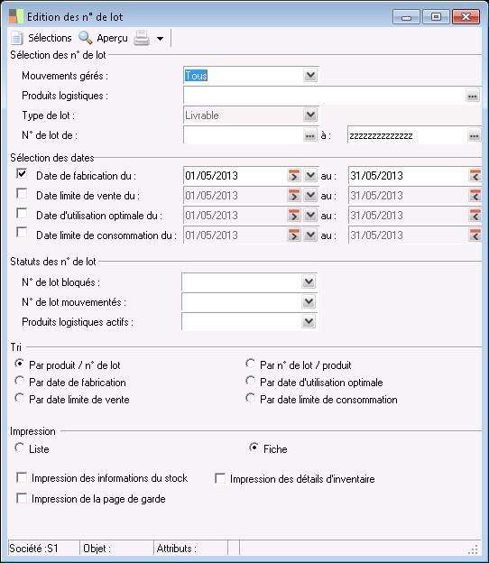 Cette fonction permet d'imprimer la liste des numéros de lot ou la fiche d'un numéro de lot particulier. Elle est lancée par la fonction Séries/Lots / Edition des n° de lot .