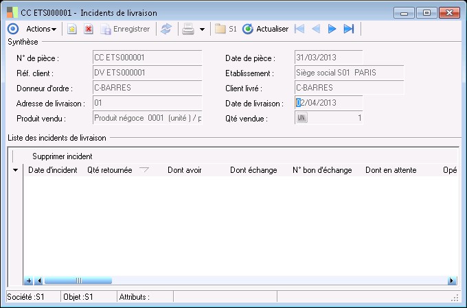 Elle affiche, pour le produit sélectionné au lancement de la fonction, les différents incidents de livraison qui ont été constatés et les pièces qui en ont découlé :