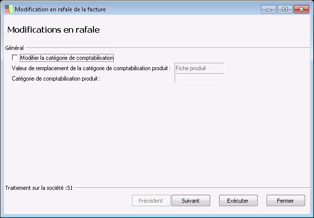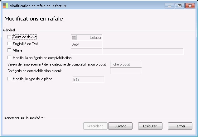Cette fonction permet de modifier en rafale un certain nombre d'informations des lignes de facture et factures d'avoir déjà saisies.