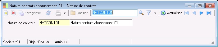 Les natures des contrats d'abonnement sont composées d'un code et d'un libellé, elles sont utilisées pour filtrer et regrouper différents types de contrats lors des traitements de génération de commandes, de renouvellement des durées ou lors des consultations et des éditions.