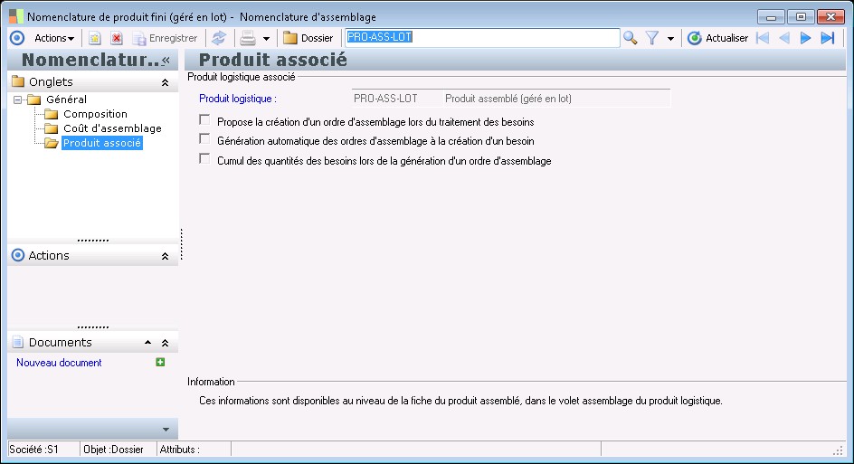 Pour pouvoir bénéficier de l'automaticité besoin / ordre d'assemblage, il est nécessaire que la zone Propose la création d'un ordre d'assemblage lors du traitement des besoins du dossierAssemblage de la fiche du produit logistique associé ait été cochée.