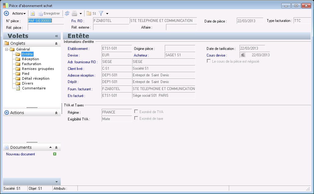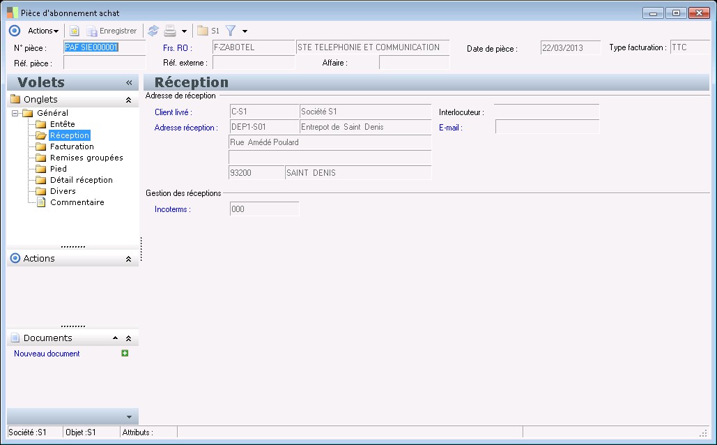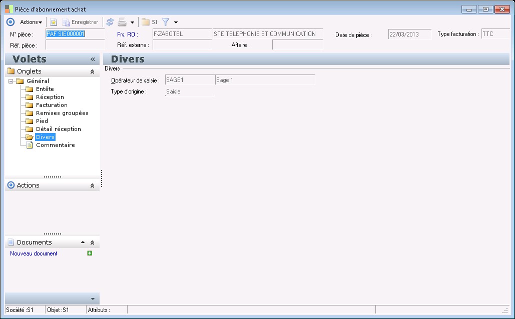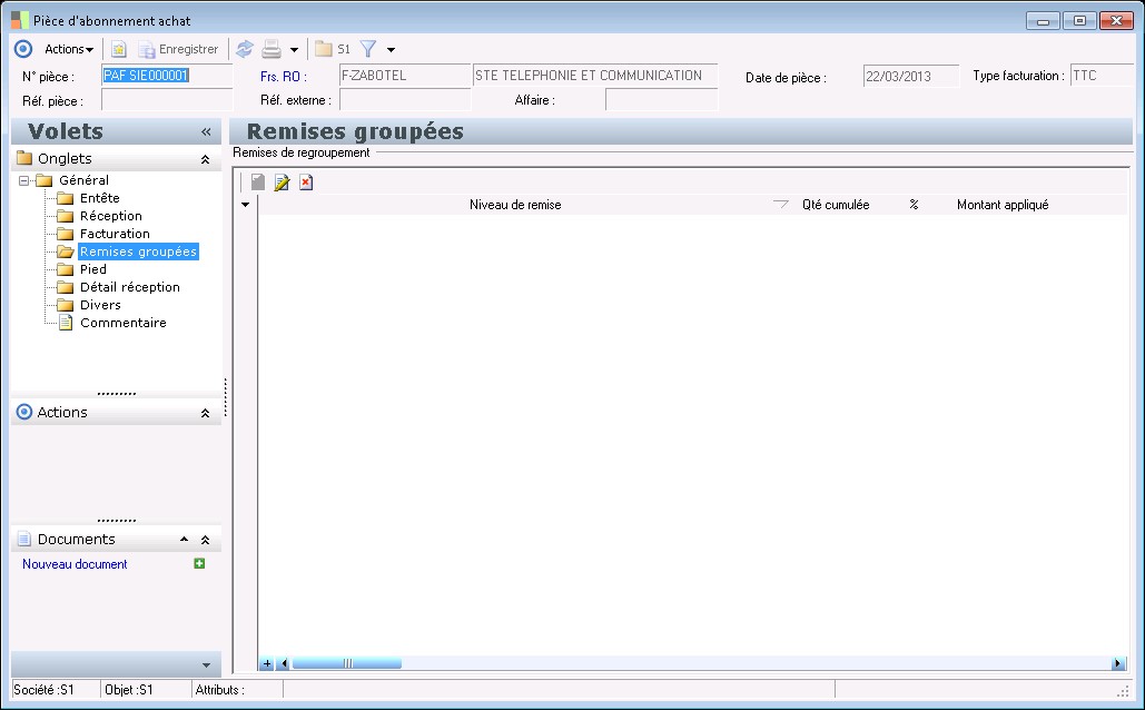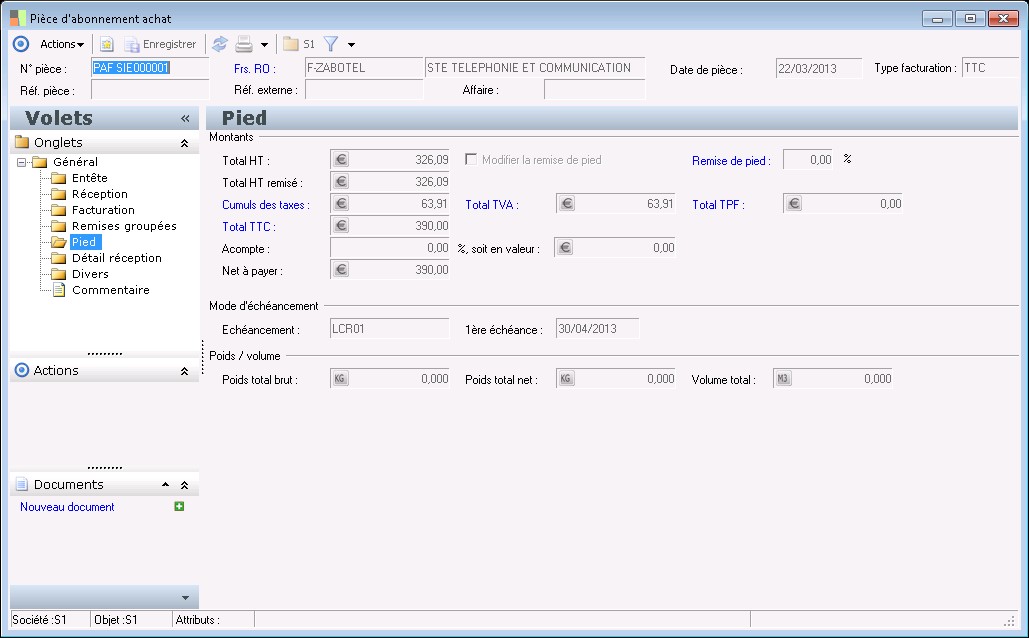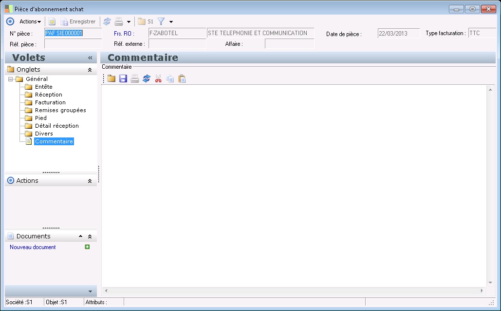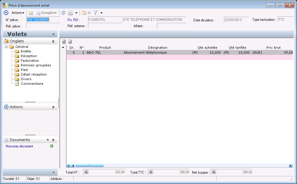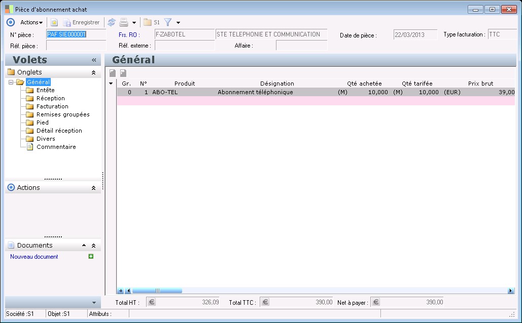 La fenêtre qui s'ouvre au lancement de la fonction Achats / Contrat d'abonnement / Saisie des contrats / menu Actions / Pièce d'abonnement sert à l'enregistrement de la pièce d'abonnement qui sert de modèle lors de la génération des commandes.