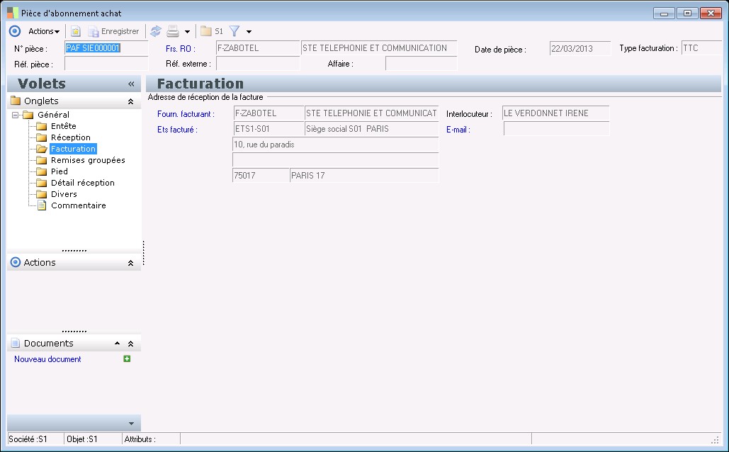Le type de facturation est initialisé par le type de facturation du fournisseur ou du client. Il permet de déterminer le type de tarif à appliquer et si les montants présentés dans la pièce sont hors taxes ou toutes taxes comprises.