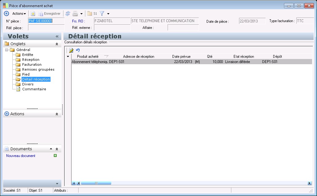 Le détail réception de la ligne de commande n'est pas saisissable, lors de la génération de la commande, la date de livraison reprise est celle de la période et le dépôt de réception est celui de l'entête, il n'est pas possible de réaliser un éclatement multi adresses ou dates de livraison pour une ligne de commande.