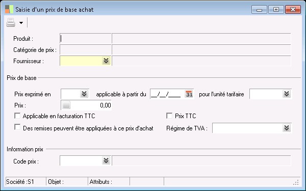 Cette fenêtre sert à l'enregistrement du prix d'achat d'un article à une date donnée chez un fournisseur donné. Elle s'ouvre à partir du sous-volet Tarifs de base/Remises achat de la fenêtre Article .