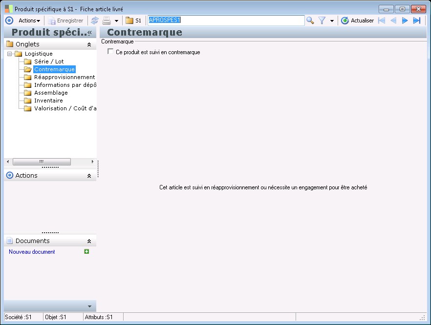 Indique que le produit est suivi en contremarque. Il n'est donc pas suivi en réapprovisionnement car l'évènement déclencheur correspond à la saisie d'une commande client ou à la saisie d'un ordre d'assemblage dans le cas d'un composant.