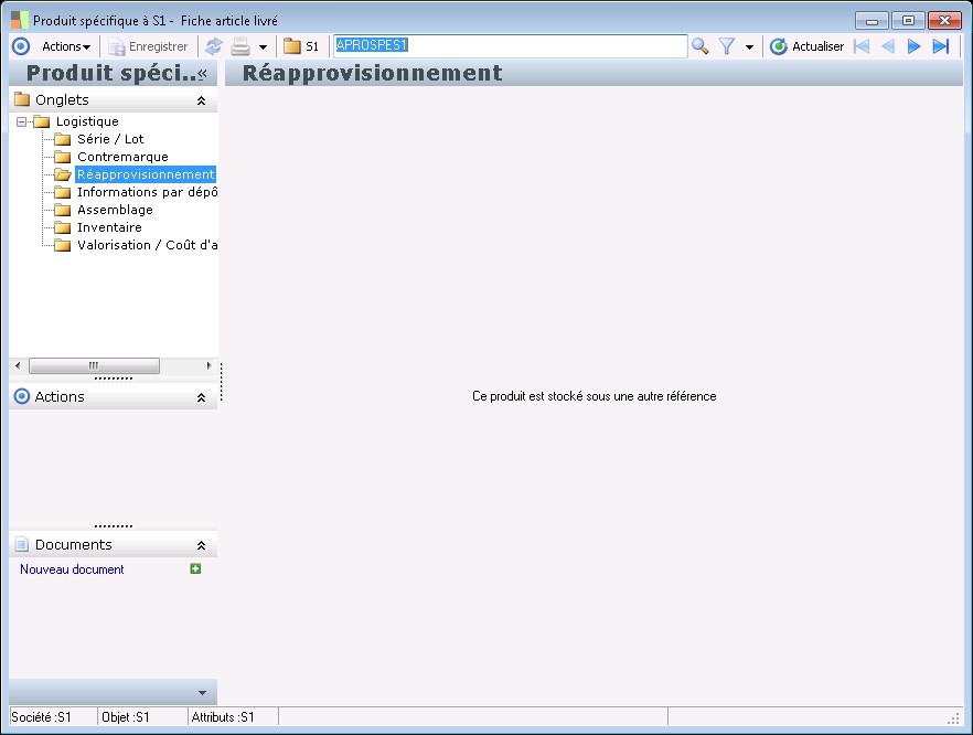 Lorsque le produit n'est pas géré en stock, ce volet a une présentation différente. Les zones traitant des stocks sont absentes et certaines zones ont un comportement particulier décrit ci-dessous. Dans le cas d'articles non gérés en stock, seule la modalité de réapprovisionnement Quantité fixe / Période fixe est utilisable car c'est la seule qui ne fasse pas appel à des informations tirées du stock. Si vous tentez de réapprovisionner un article non tenu en stock avec une modalité différente de cette dernière, un message d'erreur vous le signalera.