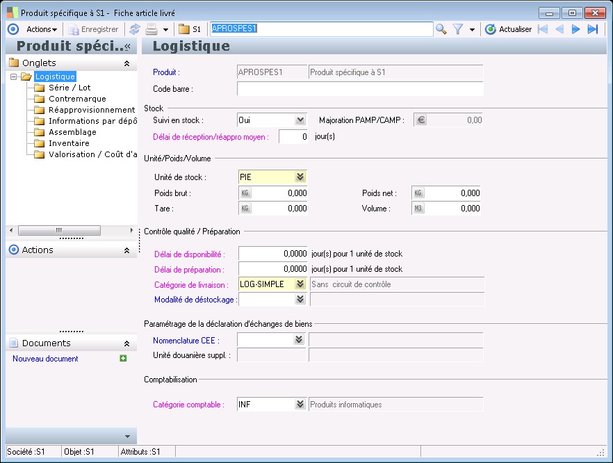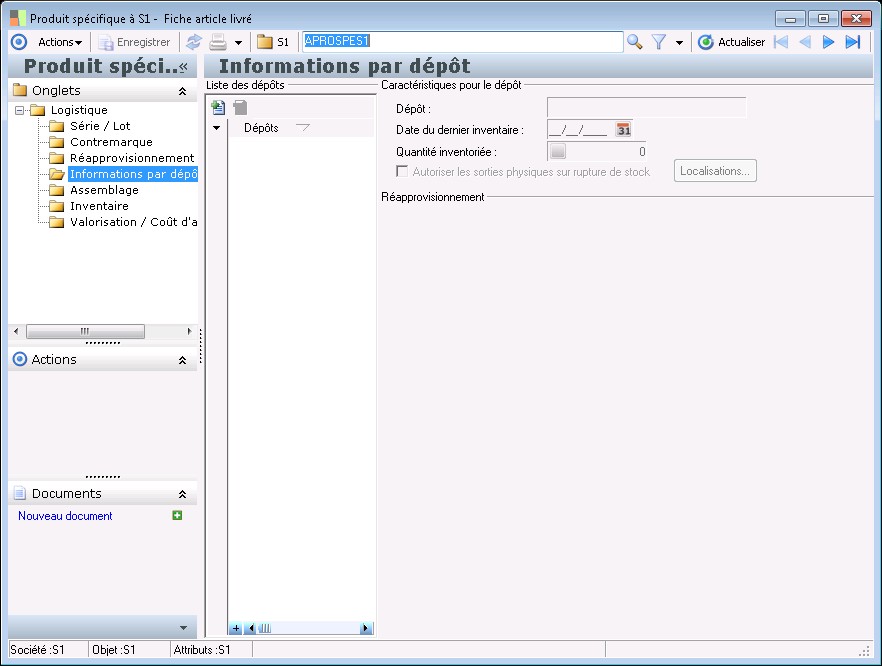 Dans le cas d'articles non gérés en stock, il est néanmoins possible de leur affecter des dépôts et même une catégorie de réapprovisionnement qui ne peut être que Quantité fixe / Période fixe , seule catégorie applicable aux articles non tenus en stock. Les informations d'inventaire sont également disponibles dans le cas où le produit aurait été tenu en stock précédemment et que les informations historisées sur son stock soient utiles.