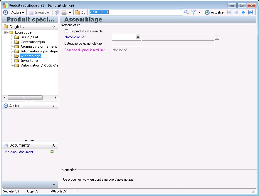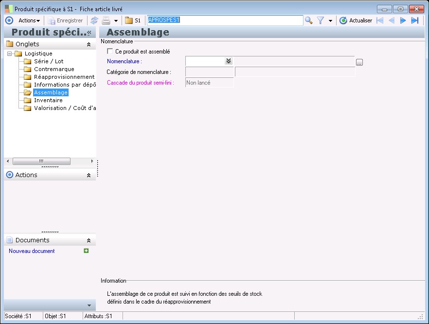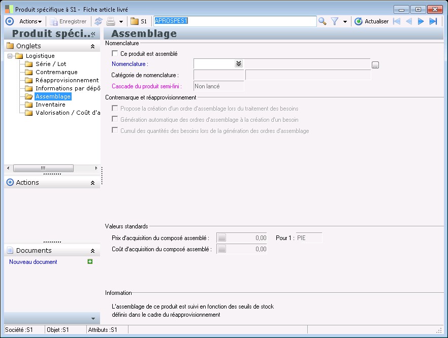 Pour indiquer que l'article sera associé à une nomenclature, il suffit de cocher l'option Ce produit est assemblé . L'article sera alors proposé comme produit logistique lors de la création d'une fiche nomenclature. Cette opération fait apparaître des options supplémentaires.
