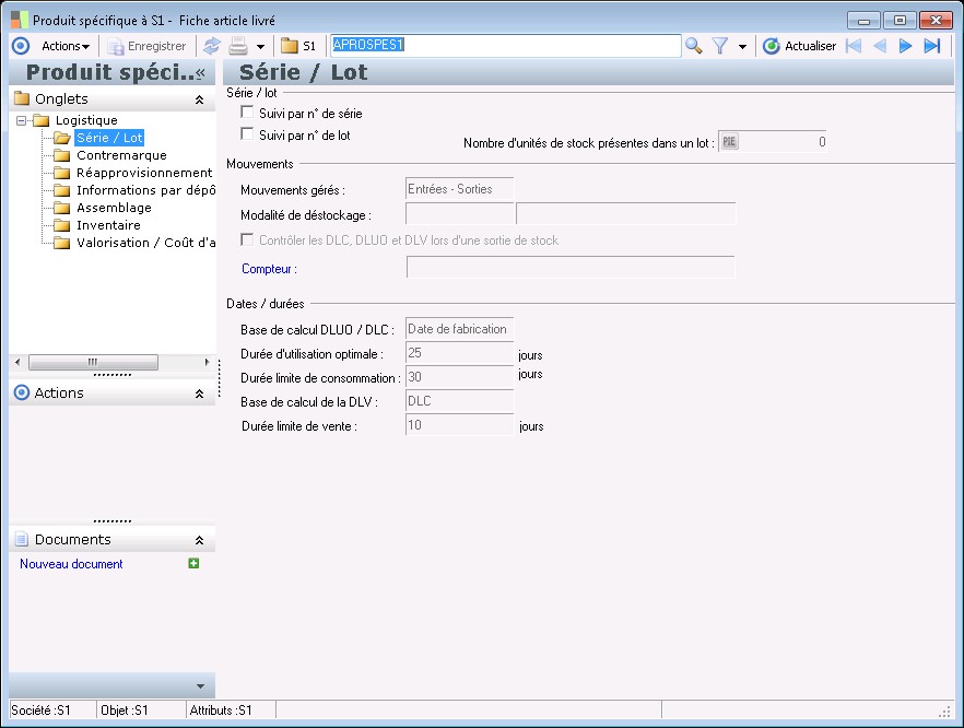 - sont saisis ou sélectionnés manuellement si aucune modalité de déstockage n'est précisée. La sortie d'un article suivi par numéro de série ou de lot s'effectuera alors de la manière suivante :