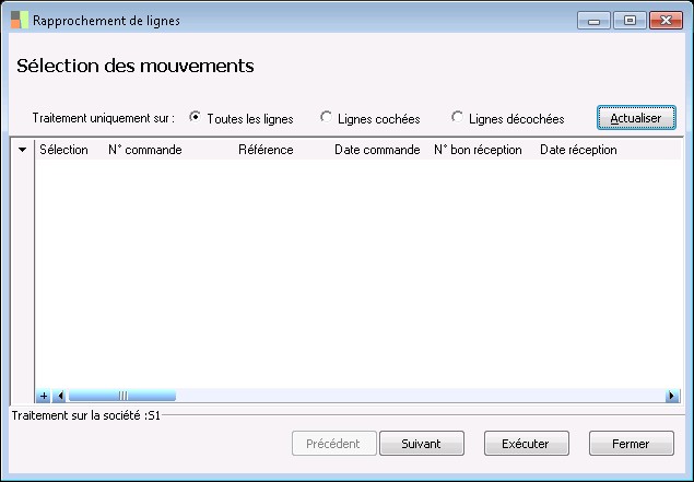 Sélectionnez les lignes qui conviennent soit en cliquant sur leur case Sélection soit en cliquant surl'option Toutes les lignes en haut de la fenêtre. Lancez le processus par le bouton Exécuter .