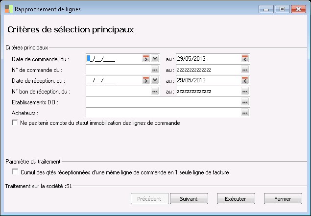 Cette fenêtre permet d'enregistrer les critères qui permettront de sélectionner des lignes de commandes et/ou de bons de réception fournisseurs.