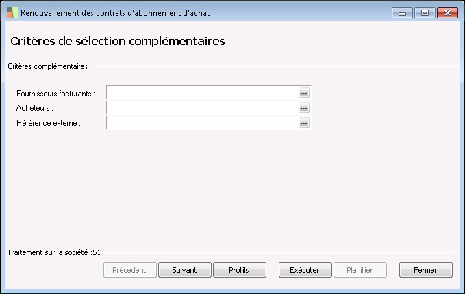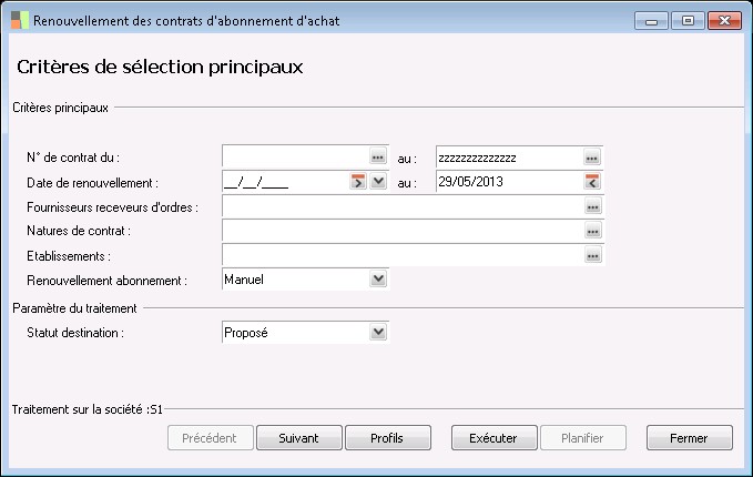 L'assistant de renouvellement des contrats permet de sélectionner les contrats arrivés à échéance, de déterminer le statut de la nouvelle durée. Il est possible de créer la nouvelle durée avec le statut Bon pour génération, dans ce cas la génération des commandes peut se faire dès que le renouvellement a eu lieu. Il est possible de créer une nouvelle durée avec le statut Proposé ce qui permet d'éditer le contrat et de recommencer la procédure d'acceptation de la nouvelle durée avec le tiers.