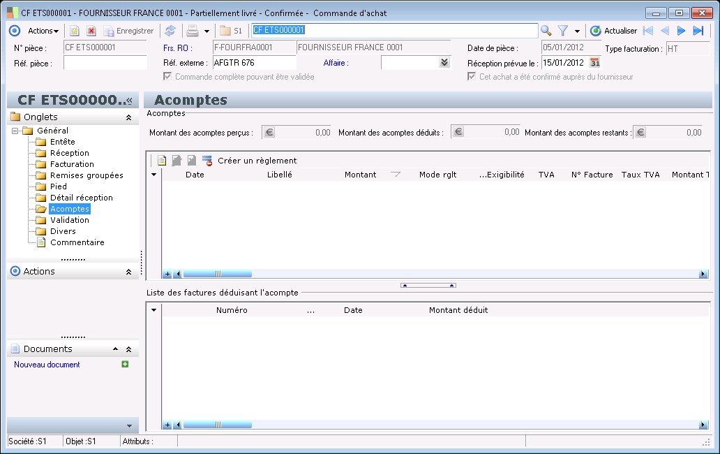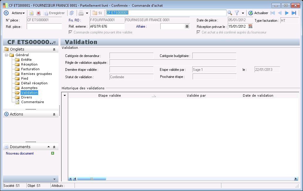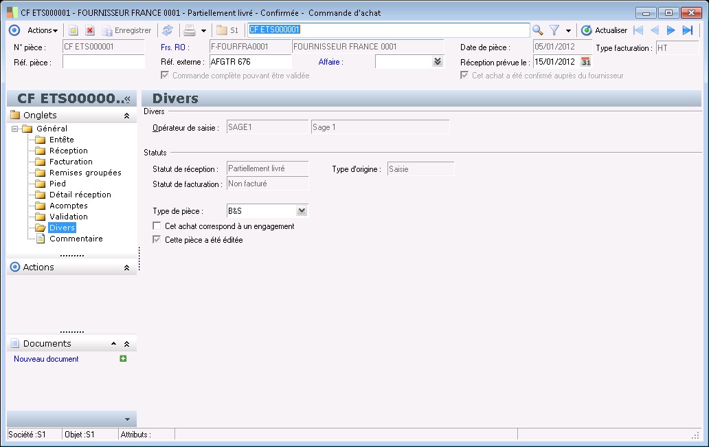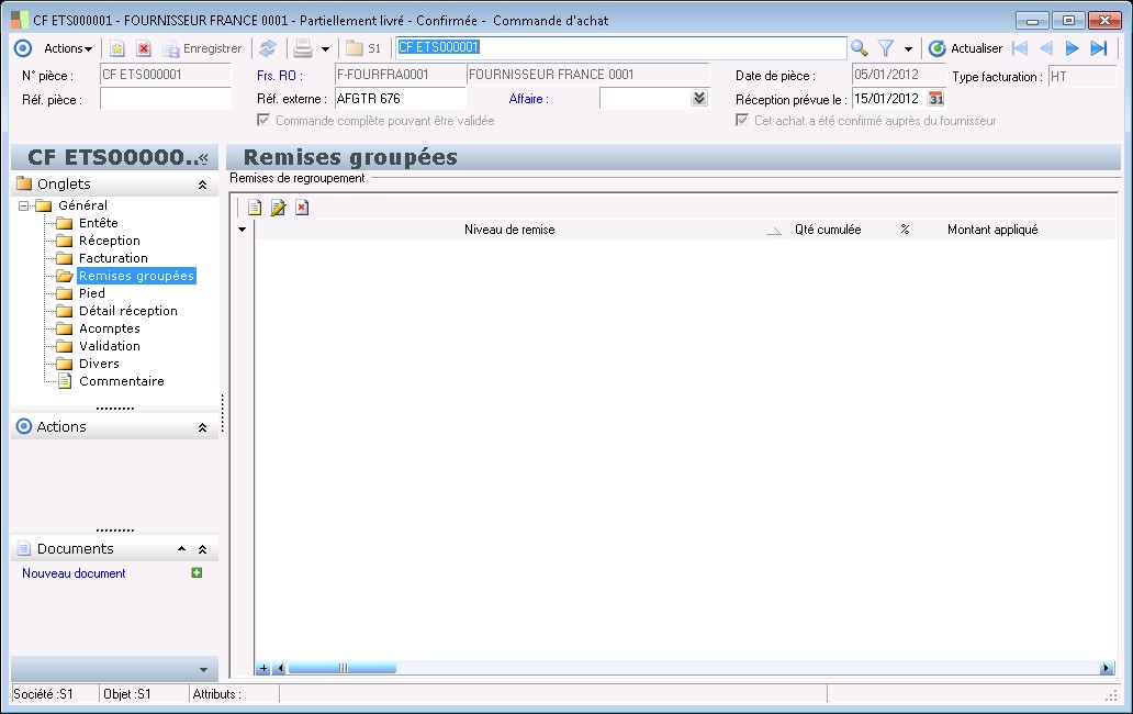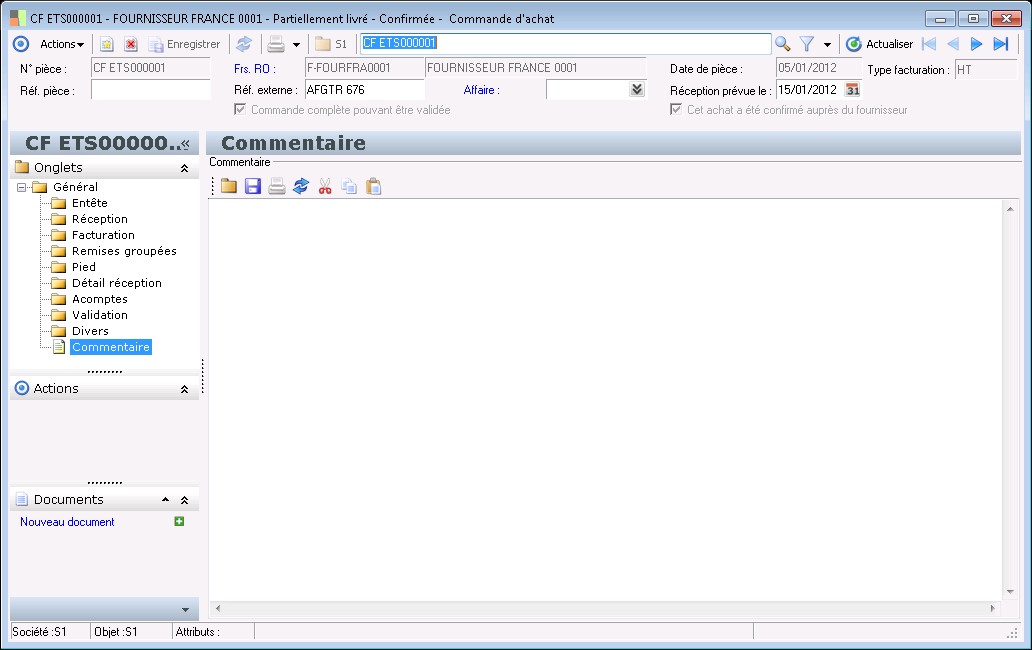 La valeur de cette zone est reprise sur chacune des lignes de la pièce sauf si un paramétrage d'affectation automatique est réalisé par l'utilisateur dans la fonction Paramètres-Tiers. Cette zonerestera néanmoins modifiable ligne à ligne ou globalement par la commande Modifications en rafale du menu Actions .