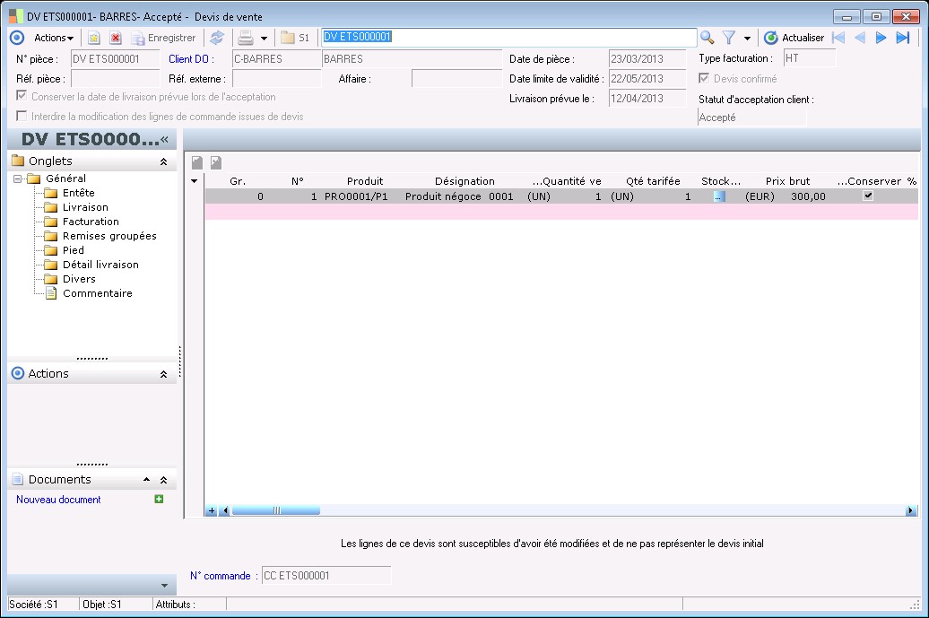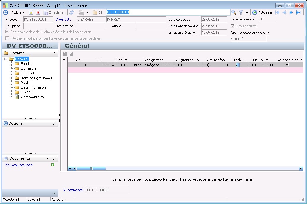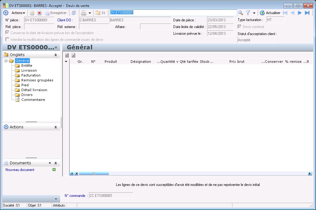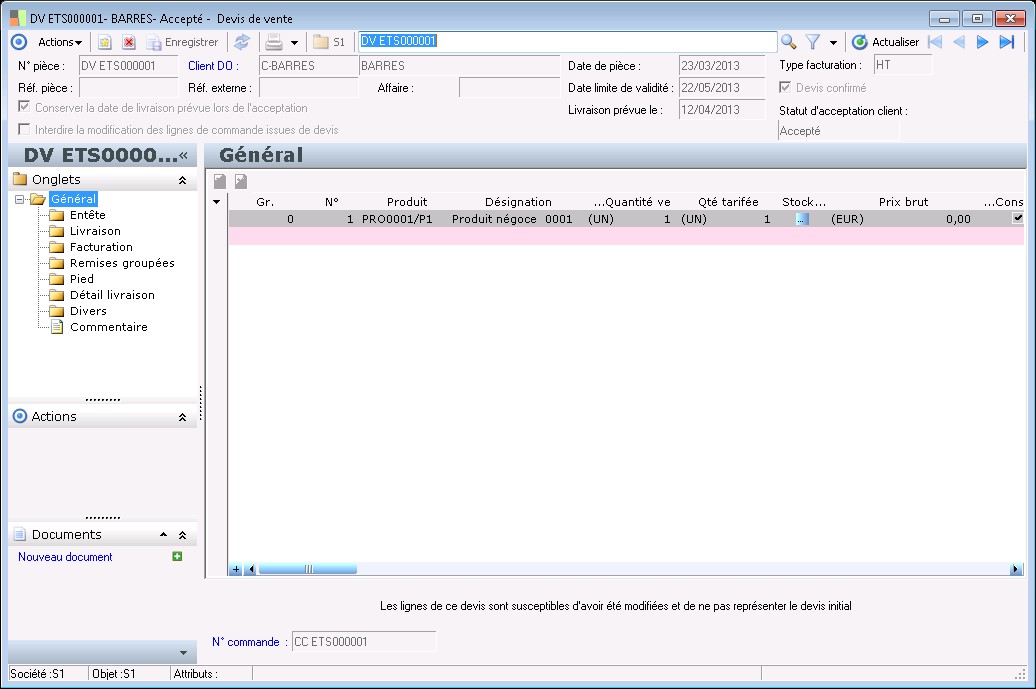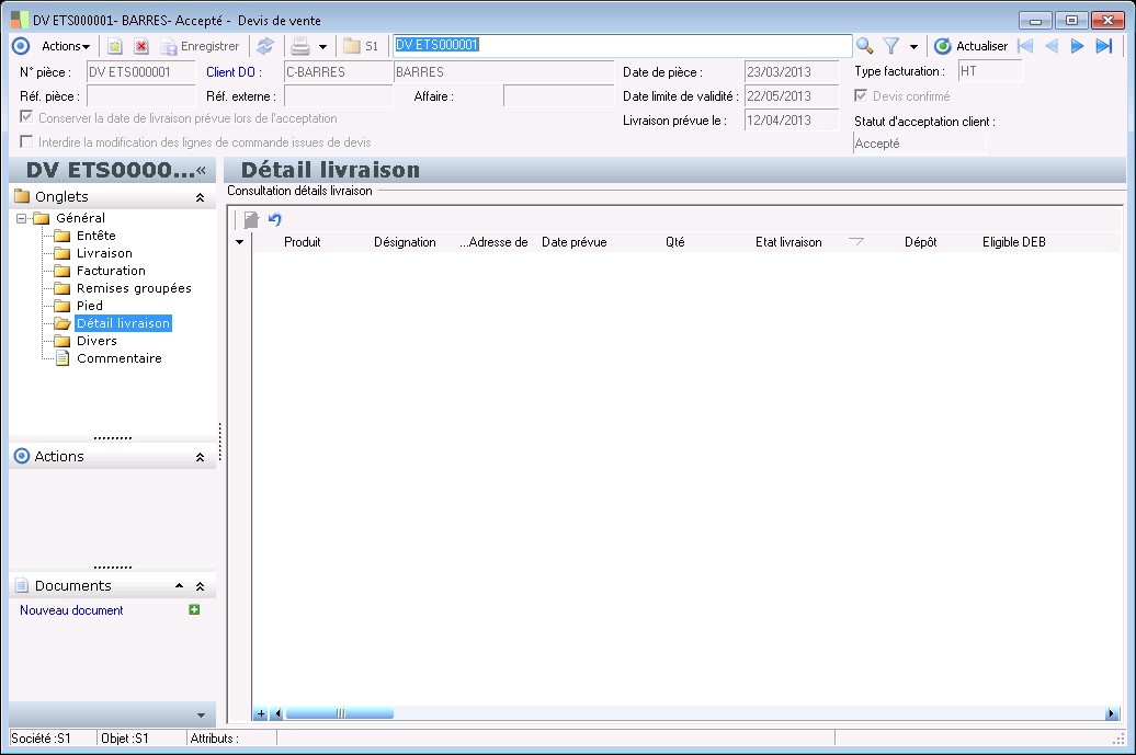 Cette zone permet d'indiquer un dépôt qui sera repris par défaut sur les détails de livraison. Cette zone est initialisée d'après le dépôt privilégié de l'adresse de livraison : seuls les dépôts autorisés sur l'établissement donneur d'ordre (en achat) ou receveur d'ordre (en vente) sont proposés. Cette information est modifiable même lorsque la pièce commerciale contient des lignes ; la velur modifiée étant prise en compte pour les nouvelles lignes saisies. L'option de modification en rafale du menu Actions permet de mettre à jour le dépôt sur l'ensemble des lignes.