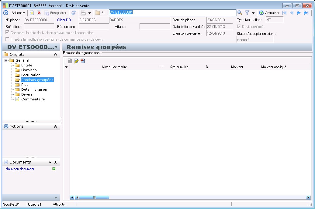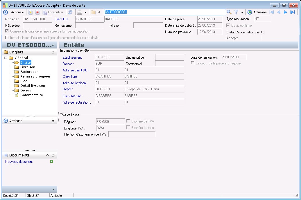 Le régime sert à identifier les taxes à appliquer à la pièce commerciale. Il est déterminé automatiquement d'après le paramétrage des régimes en fonction de la territorialité de l'adresse de livraison et de celle de l'établissement receveur d'ordre. Exemple : dans le paramétrage des régimes, il est indiqué que pour une territorialité Livrée = France et une territorialité Receveur d'ordre = France le régime est France. Si le livré et l'établissement ont des territorialités France le régime repris dans le contrat commercial sera France.