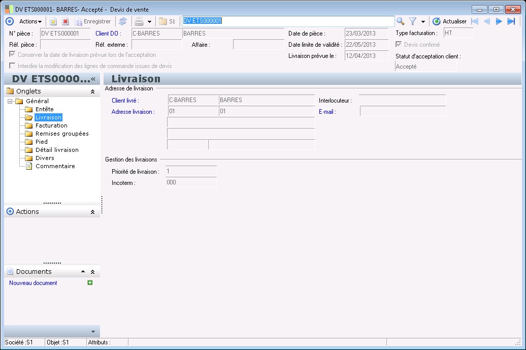 Adresse de livraison proposée pour la pièce commerciale et initialisée d'après l'adresse de livraison privilégiée du tiers livré sélectionné. Il s'agit de l'une des adresses de livraison du tiers livré. Cette adresse sera reprise par défaut sur chaque ligne de la pièce commerciale, où il est possible de la modifier.
