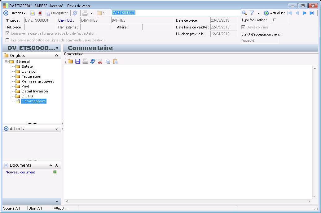 En vente, cette zone indique le commercial pour lequel la pièce commerciale est passée. Elle est initialisée d'après le commercial indiqué sur la fiche du client donneur d'ordre.