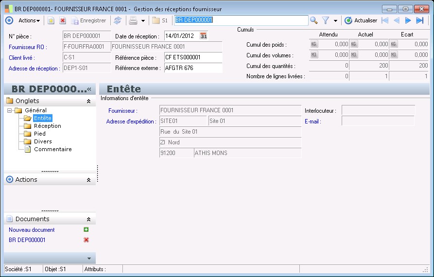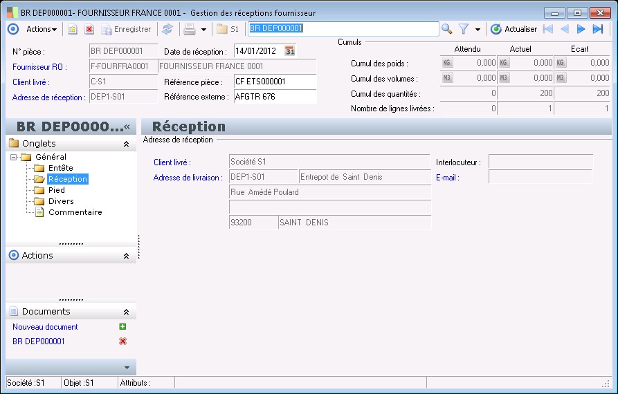 - Réception : ce dossierprécise le client livré : la société, ainsi que l'adresse du dépôt réceptionnaire, celui mentionné dans la têtière de la fenêtre. Aucune modification n'est possible dans le dossierlui-même.