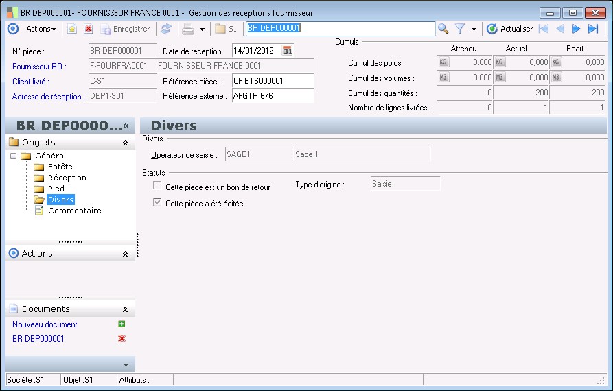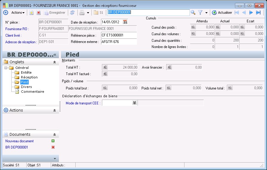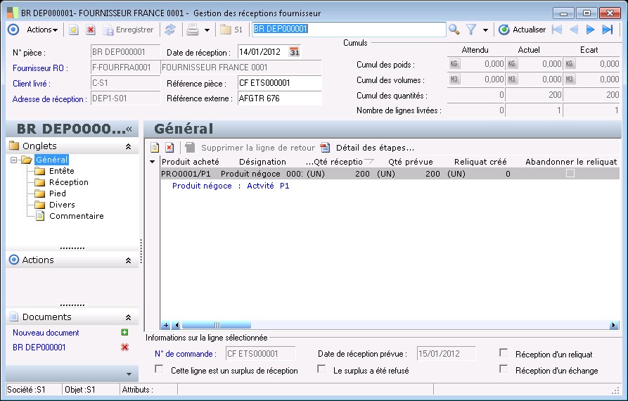 La pièce ainsi générée passe de l'état différé (commandes) à l'état immédiat (bons de réception) : les produits sont affectés à la première étape du circuit de réception immédiate.