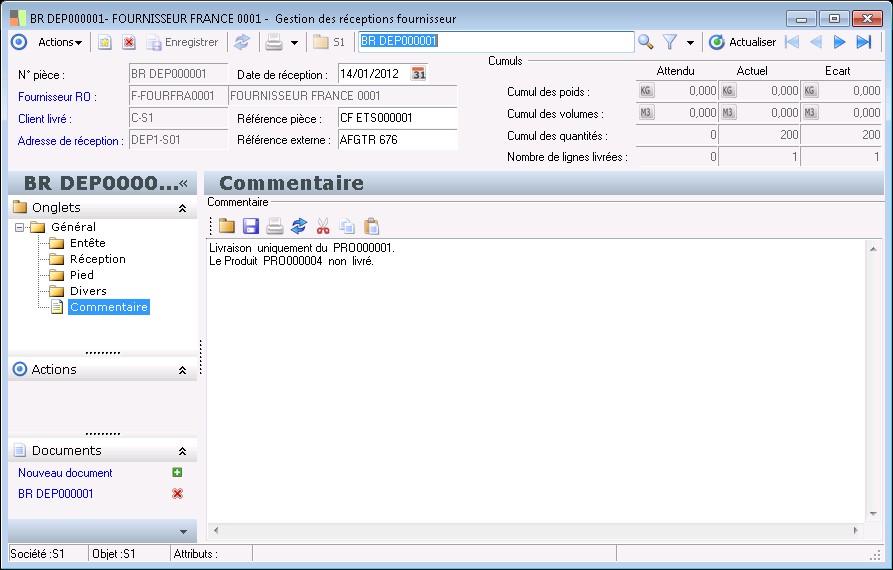 L'enregistrement de quantités réceptionnées inférieures à celles commandées se fait simplement en :