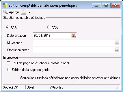 Les éditions comptables permettent de visualiser, par situation*, l'écriture comptable avant sa génération. Il n'est plus possible d'éditer une situation lorsqu'elle est comptabilisée.