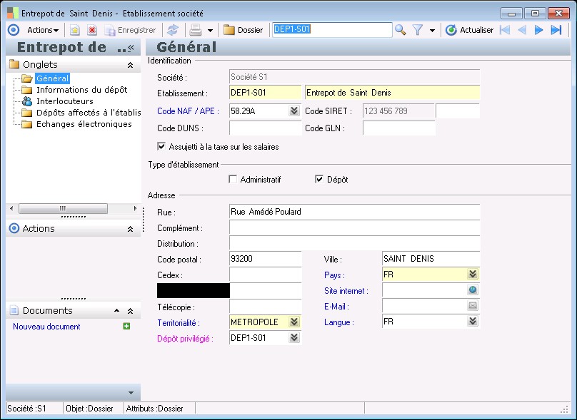 Cette zone permet de renseigner le pays d'après les informations contenues dans la table des pays. Le pays proposé par défaut correspond à celui de l'établissement indiqué dans la fiche société.