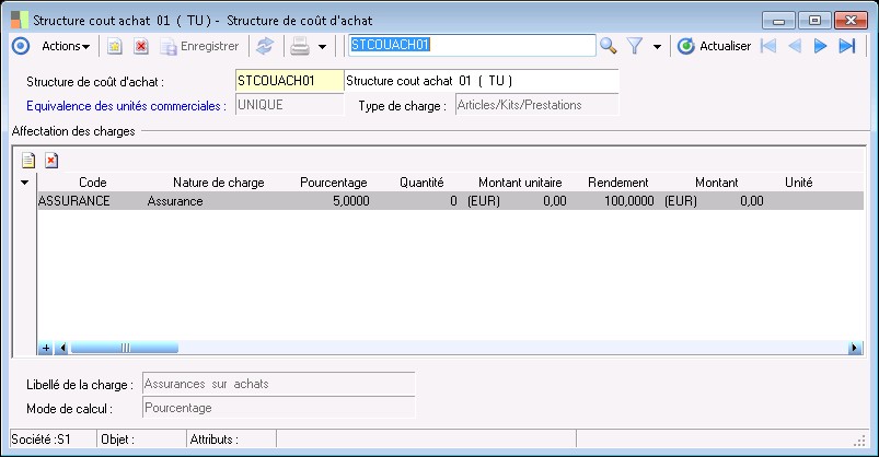 - Montant unitaire : saisie d'un montant unitaire de charge. Lorsque la charge est directe, le montant est défini pour une quantité/une unité de poids/une unité de volume de produit.
