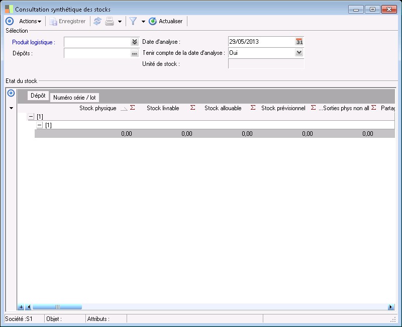 La grille Etat du stock mentionne, en fonction des critères de sélection paramétrés, les quantités trouvées en stocks physiques, livrables, allouables et prévisionnels.