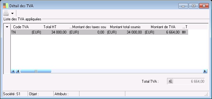 Montant calculé de la TVA qui sert dans les pièces commerciales et facturations. Ce calcul est réalisé sur les bases de TVA auxquelles sont appliquées les taux de TVA paramétrés en fonction du régime et des articles choisis.