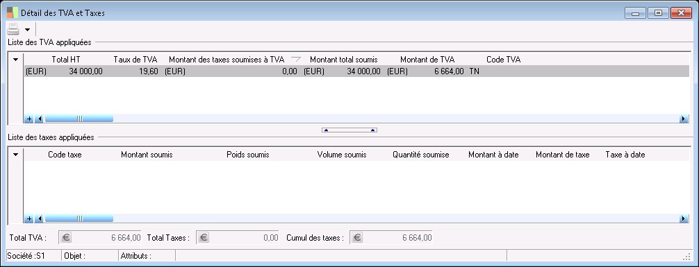 Montant calculé de la TVA qui sert dans les pièces commerciales et facturations. Ce calcul est réalisé sur les bases de TVA auxquelles sont appliquées les taux de TVA paramétrés en fonction du régime et des articles choisis.