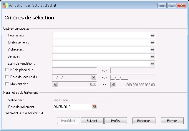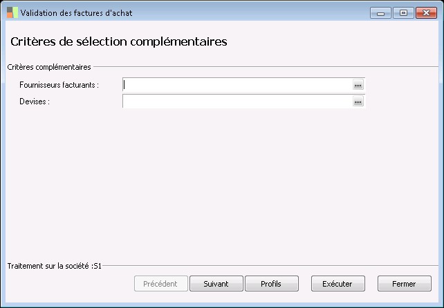 Les deux premiers écrans permettent de renseigner des critères de sélection des factures d'achat à valider.