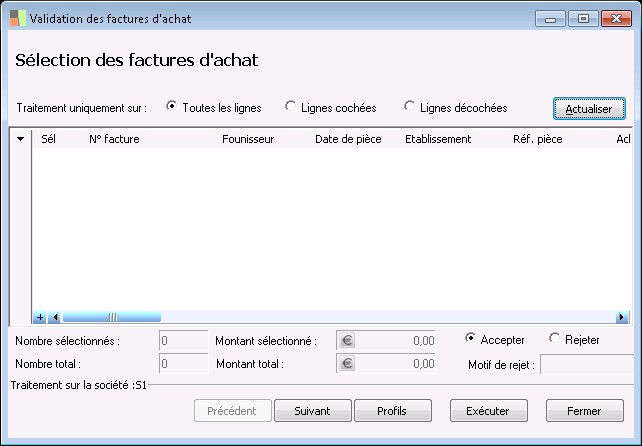 Les factures d'achat proposées à la sélection sont cellesqui répondent aux critères de sélection saisis.