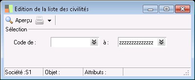 Cette fonction permet d'éditer la liste des civilités en fonction de certains critères de sélection. Elle est lancée par la fonction Impression de la liste et de la fiche des civilités, elles-mêmes accessibles au niveau du menu Paramètres / Société / Civilités.