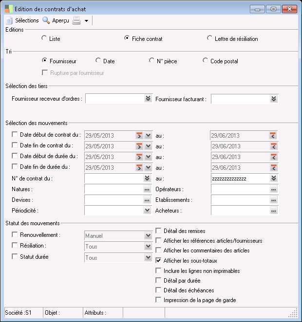 Elle est lancée à partir de la fonction Achats / Contrats d'abonnements / Editions / Edition des contrats ou à partir du menu Impression / Edition des contrats d'achat en saisie de contrat.