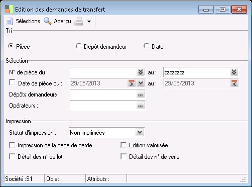 Cette fonction permet d'imprimer les piècesde demandes de transfert interdépôts. Elle est lancée par la fonction Stocks / Transfert inter-dépôts / Edition des demandes de transfert .