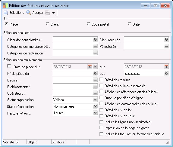 Cette fonction permet d'imprimer les factures et factures d'avoir clients. Elle est lancée à partir de la fonction Ventes / Facturation / Édition des factures et avoirs .