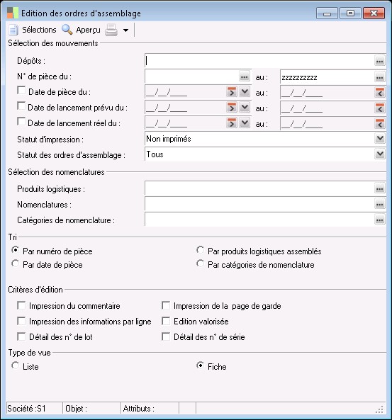 Cette fonction permet d'éditer les ordres d'assemblage en cours ou assemblés, sous forme de liste ou de fiches. Cette dernière possibilité est utile pour la remise des ordres aux employés chargés de l'assemblage. Elle est lancée à partir de la fonction Stocks / Ordres d'assemblage / Edition des ordres d'assemblage .