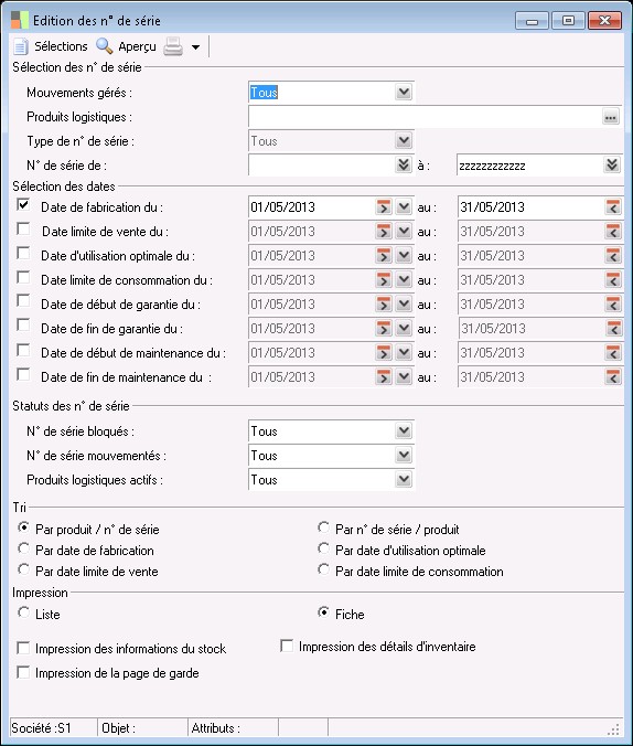 Cette fonction permet d'imprimer la liste des numéros de série ou la fiche d'un numéro de série particulier. Elle est lancée par la fonction Séries/Lots / Edition des n° de série .