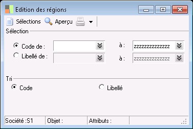 Cette fonction permet d'éditer la liste des régions en fonction de certains critères de sélection. Elle est lancée par la fonction Impression de la liste et de la fiche des régions, elles-mêmes accessibles au niveau du menu Paramètres / Généraux / Régions.