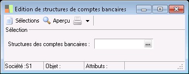 Cette fonction permet d'éditer la liste des structures de comptes bancaires en fonction de certains critères de sélection. Elle est lancée par la fonction Impression de la liste et de la fiche des structures de compte, elles-mêmes accessibles au niveau du menu Paramètres / Bancaires / Structures de comptes bancaires.