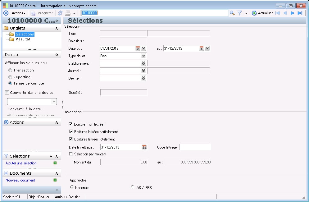 dans la partie Sélections : des paramètres de consultation du compte général :