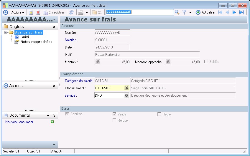 Exemple : Un salarié dispose d'une avance de 200 euros. Une note de frais de 50 euros saisie sur ce même salarié a été comptabilisée.