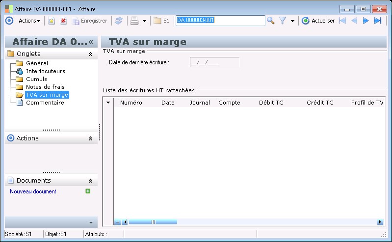 Cet onglet affiche la date de dernière écriture pour la TVA sur marge et la liste des écritures de HT rattachées.