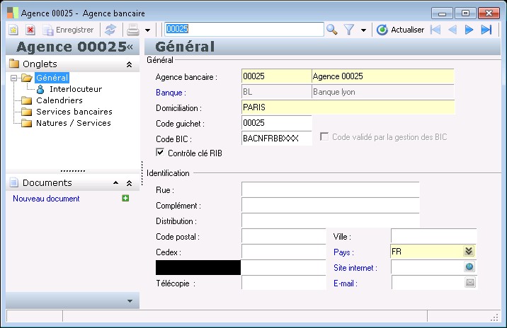 L'agence bancaire appartient à une banque. La saisie du code banque est obligatoire et identifie le code établissement.
