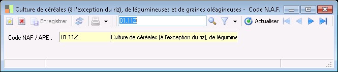 La fenêtre de saisie des codes NAF (ex codes APE) permet d'enregistrer le code et la désignation du code.